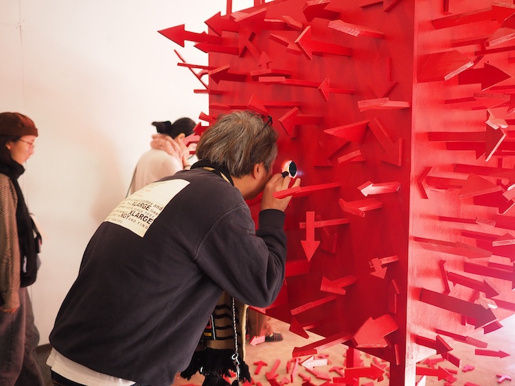 作品をのぞき込みながら、空間の作り手の工夫にも触れます。